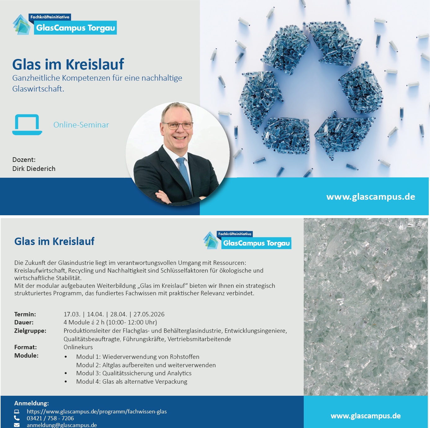 ab 17. März 2026 biete ich  am GlasCampus Torgau eine Weiterbildung zum Thema GLAS IM KREISLAUF an.