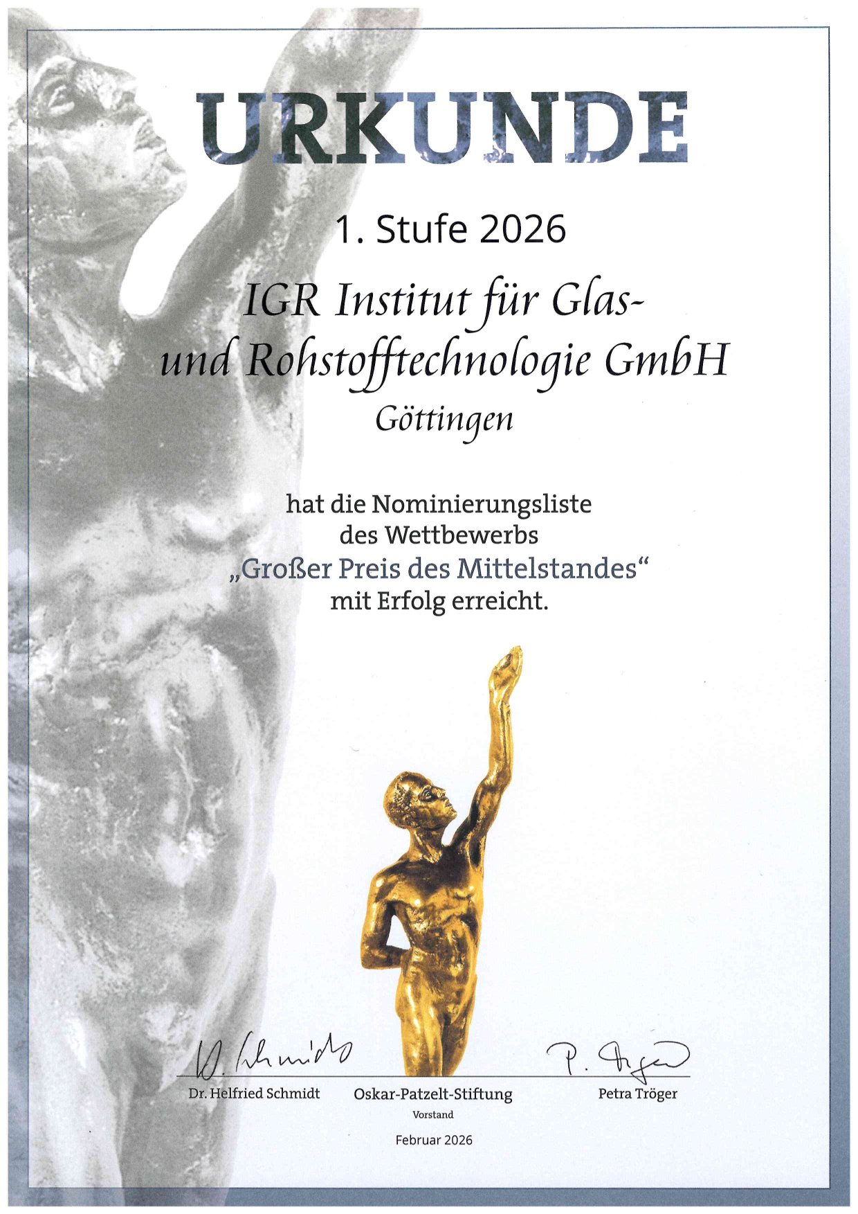 Wir wurden erneut für den Wettbewerb „Großer Preis des Mittelstandes“ der Oskar-Patzelt-Stiftung nominiert.