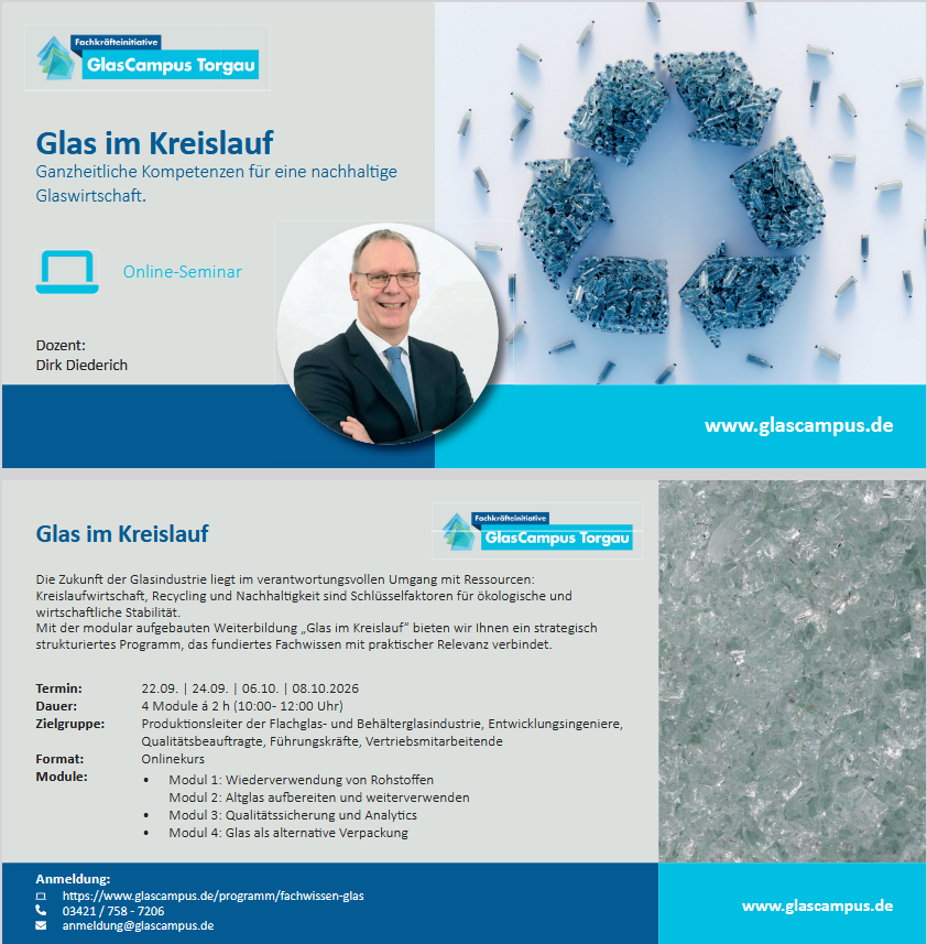 ab 22. September 2026 biete ich am GlasCampus Torgau eine Weiterbildung zum Thema GLAS IM KREISLAUF an.