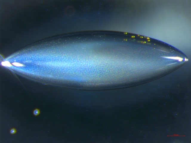 From time to time, we analyse very special blisters, known as vacuum blister (also called vacuoles), which are blisters without crystalline or gaseous content. They occur when the glass cools too quickly during production. These special blisters are not present during the forming process, but only develop afterwards. Physically and chemically dissolved gases in the glass have no way (high viscosity, low temperature, no time) to diffuse into this cavity. These blisters can also no longer float up (viscosity > log 10^7.6). Our analyses revealed no crystals and no gas content, so they are empty.